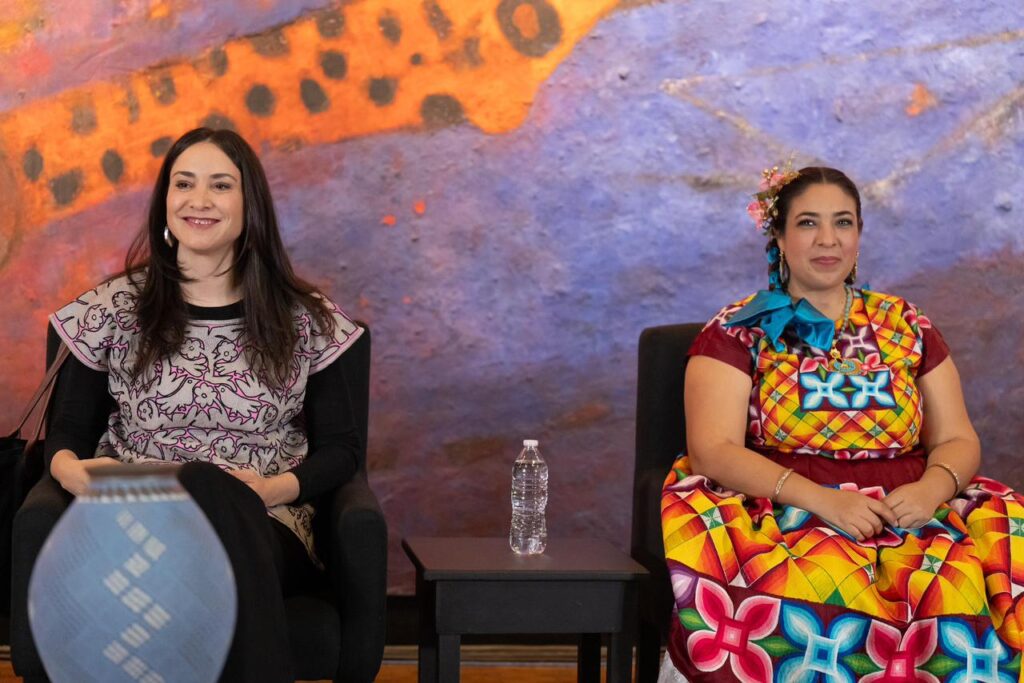 En la conferencia de prensa, participaron las maestras artesanas Adriana Ramón, de Tehuantepec, Oaxaca, y Elena Bautista Pérez, de la región de Amatenango del Valle Chiapas, quienes participarán en la feria con motivo del Día de la Artesana y el Artesano, que se realizará del 20 al 22 de marzo de 2026 en el Complejo Cultural Los Pinos.